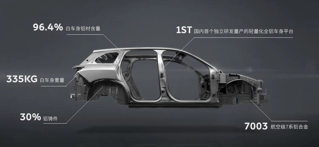 蔚來(lái)汽車(chē)為國(guó)內(nèi)新能源汽車(chē)輕量化風(fēng)向標(biāo)。蔚來(lái)汽車(chē)作為國(guó)內(nèi)的新能源汽車(chē)明星品牌,加注輕量化,在新能源汽車(chē)輕量化領(lǐng)域也取得了一定的成效。蔚來(lái)ES8車(chē)身運(yùn)用了諾貝麗斯(Novelis)先進(jìn)的汽車(chē)鋁合金,全鋁車(chē)身比傳統(tǒng)鋼制車(chē)身降低了約40%的重量,最終實(shí)現(xiàn)白車(chē)身重量?jī)H為335kg,車(chē)身用鋁率達(dá)到95.8%,為全球最高。